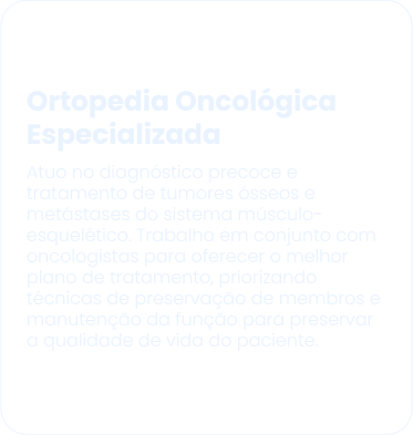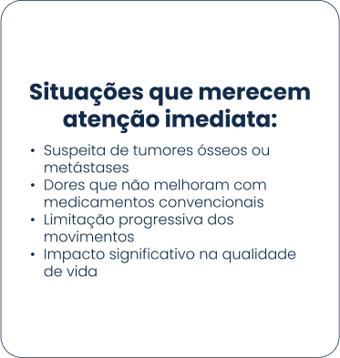 Você deve procurar um ortopedista oncológico se foi diagnosticado com tumor ósseo, apresenta dor óssea persistente sem causa aparente, tem metástases ósseas ou foi encaminhado por seu médico para avaliação de lesões suspeitas. O ortopedista oncológico possui treinamento especializado para diagnosticar e tratar tumores musculoesqueléticos, trabalhando em conjunto com oncologistas para oferecer tratamento multidisciplinar completo.